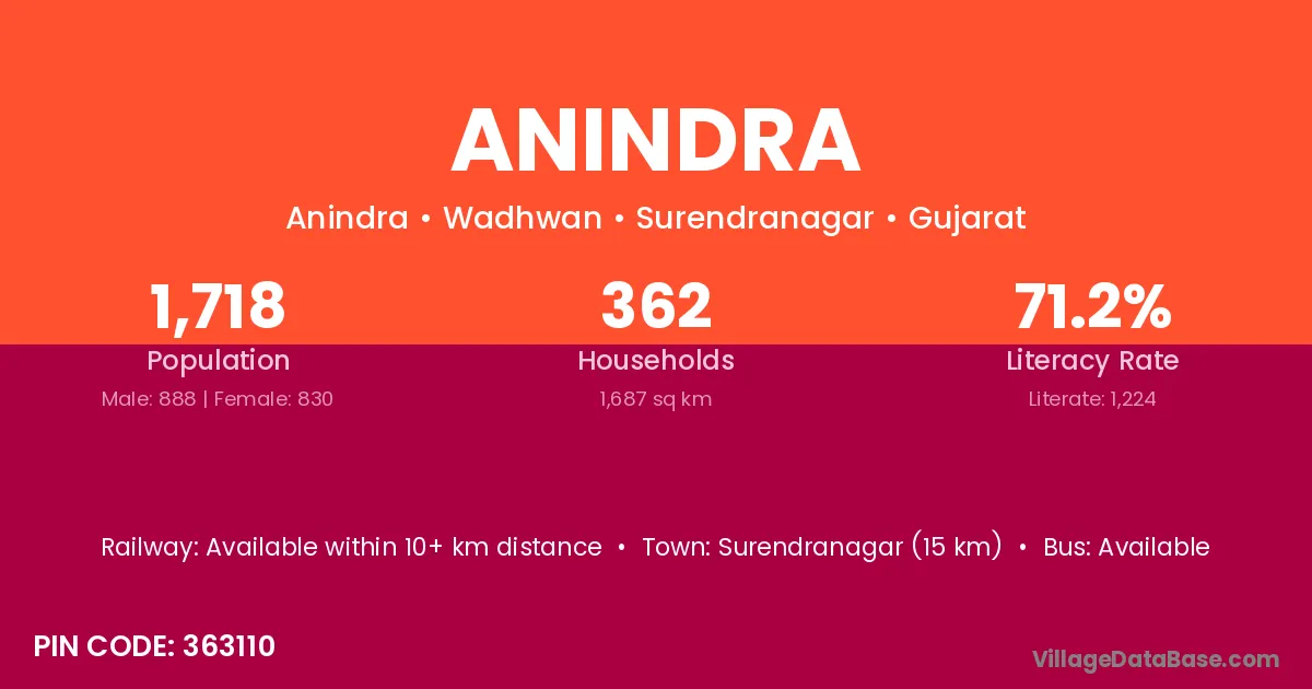 Surendranagar (15 km) is the nearest town to Anindra village for major economic activities and is located approximately 15 km away.