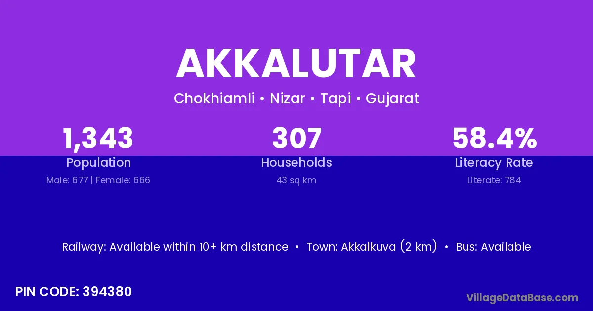 Akkalutar village has a total population of 1,343 people, of which 677 are males and 666 are females.