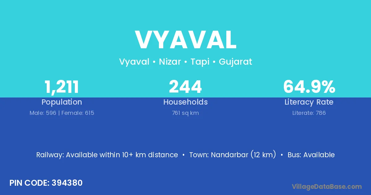 Nandarbar (12 km) is the nearest town to Vyaval village for major economic activities and is located approximately 12 km away.