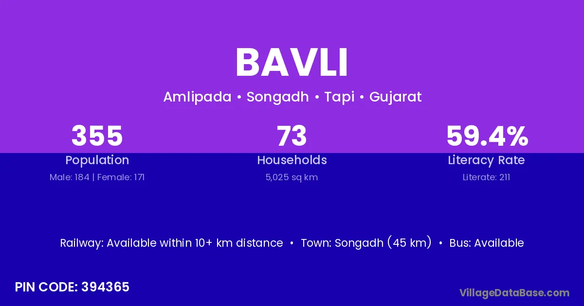 Songadh (45 km) is the nearest town to Bavli village for major economic activities and is located approximately 45 km away.