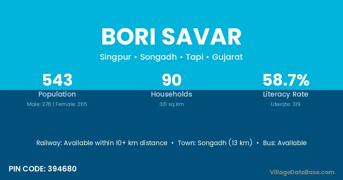 Songadh (13 km) is the nearest town to Bori Savar village for major economic activities and is located approximately 13 km away.