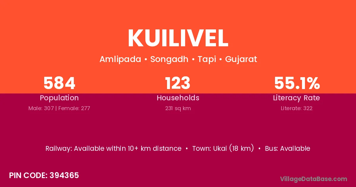 Ukai (18 km) is the nearest town to Kuilivel village for major economic activities and is located approximately 18 km away.