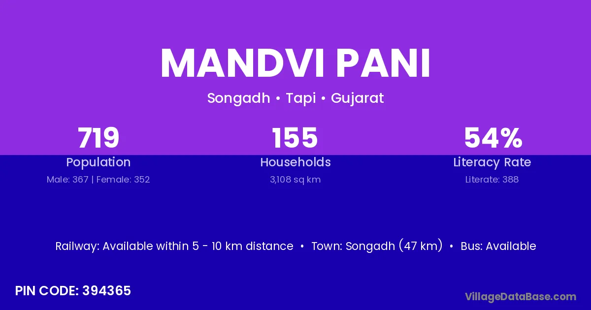 Songadh (47 km) is the nearest town to Mandvi Pani village for major economic activities and is located approximately 47 km away.