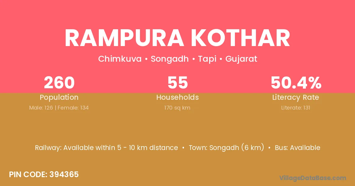 Songadh (6 km) is the nearest town to Rampura Kothar village for major economic activities and is located approximately 6 km away.