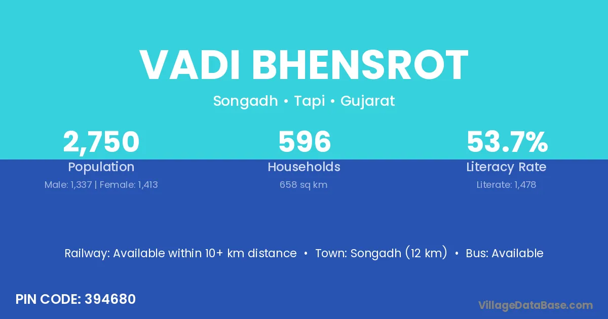 Songadh (12 km) is the nearest town to Vadi Bhensrot village for major economic activities and is located approximately 12 km away.