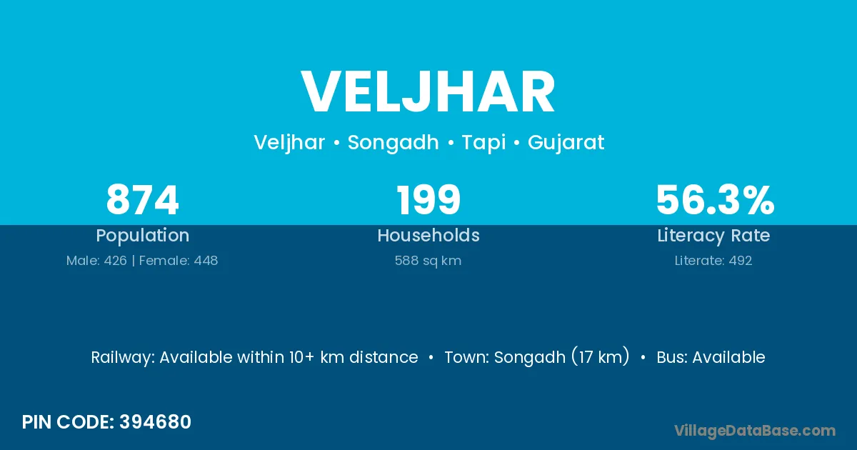 Songadh (17 km) is the nearest town to Veljhar village for major economic activities and is located approximately 17 km away.