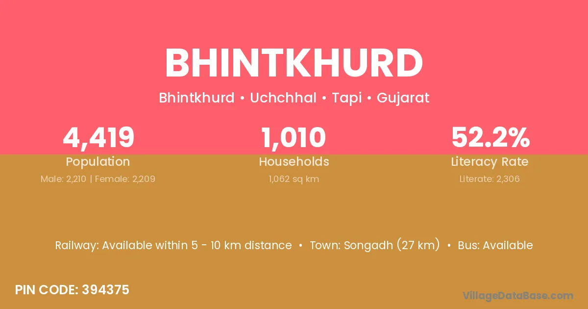 Songadh (27 km) is the nearest town to Bhintkhurd village for major economic activities and is located approximately 27 km away.