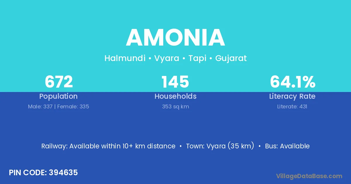 Vyara (35 km) is the nearest town to Amonia village for major economic activities and is located approximately 35 km away.