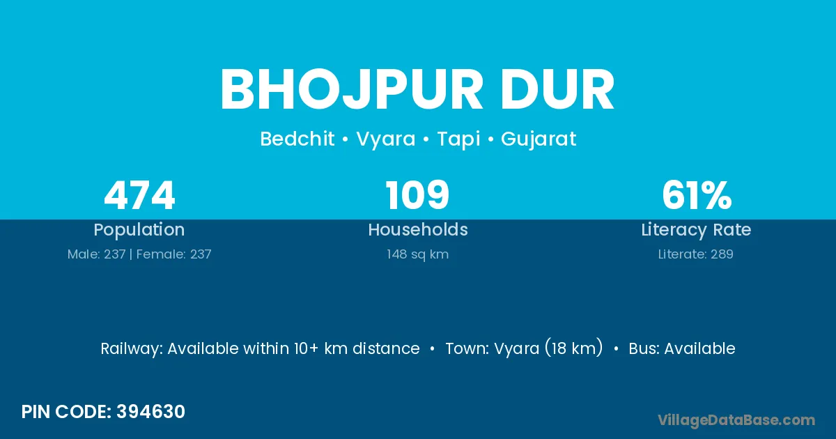 Vyara (18 km) is the nearest town to Bhojpur Dur village for major economic activities and is located approximately 18 km away.