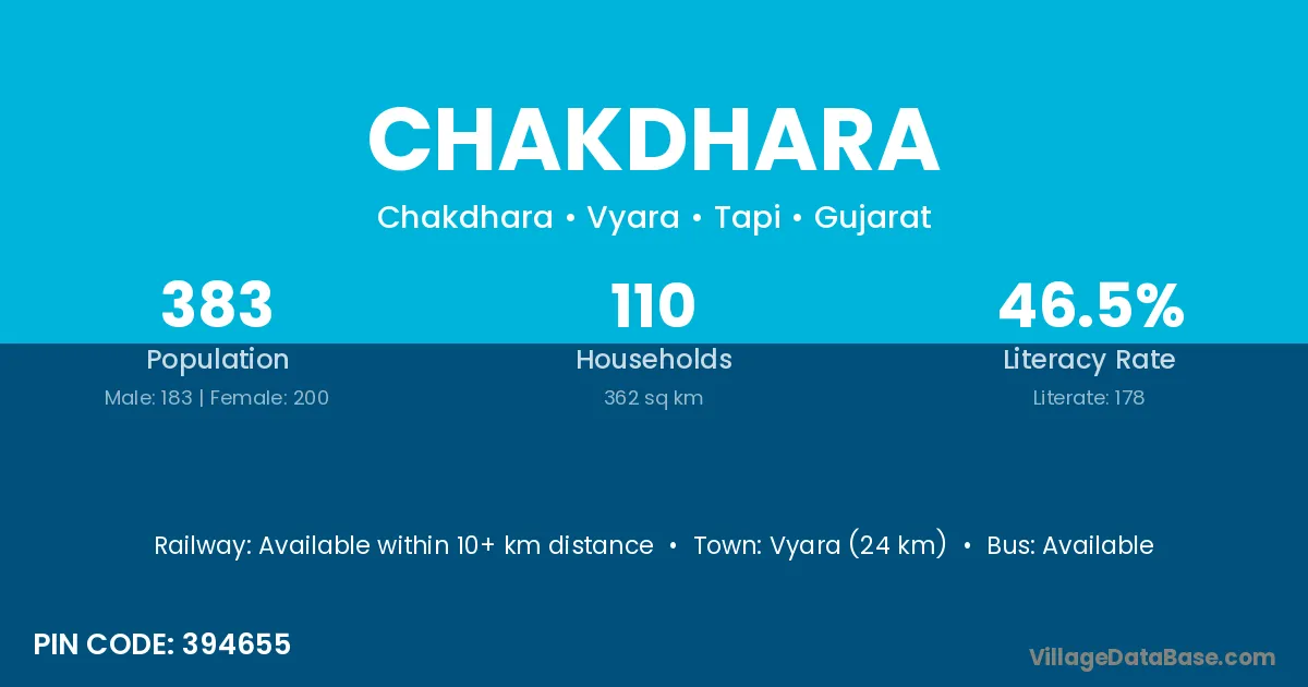 Vyara (24 km) is the nearest town to Chakdhara village for major economic activities and is located approximately 24 km away.
