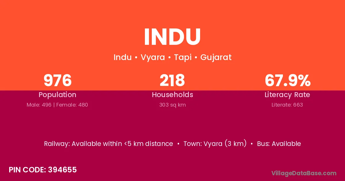 Vyara (3 km) is the nearest town to Indu village for major economic activities and is located approximately 3 km away.