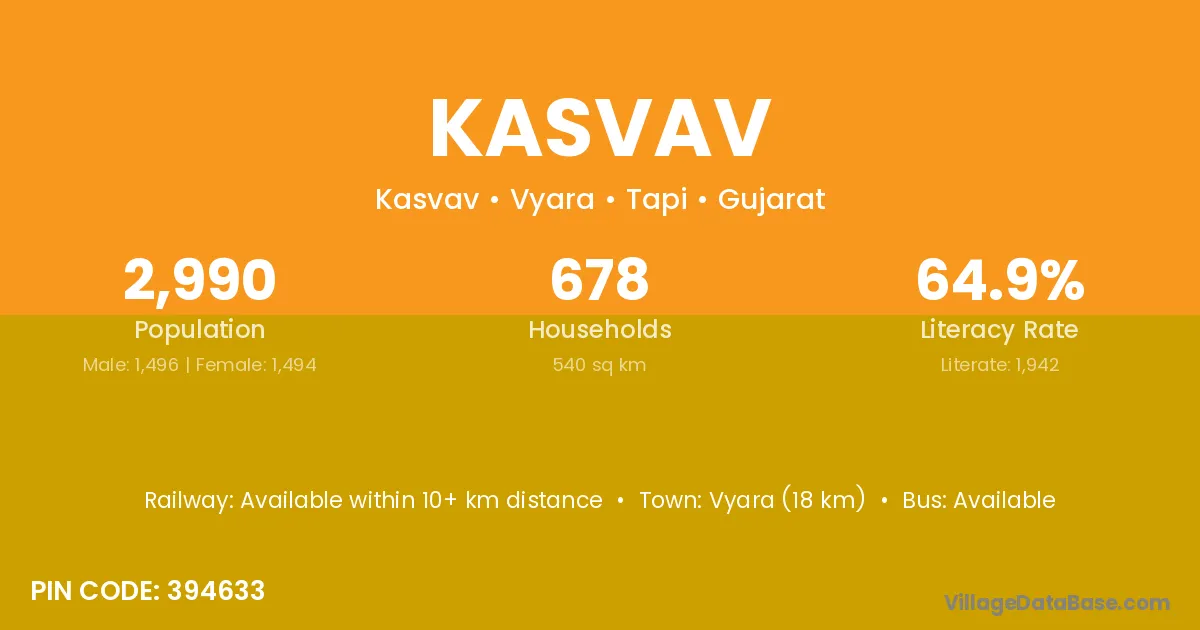 Vyara (18 km) is the nearest town to Kasvav village for major economic activities and is located approximately 18 km away.