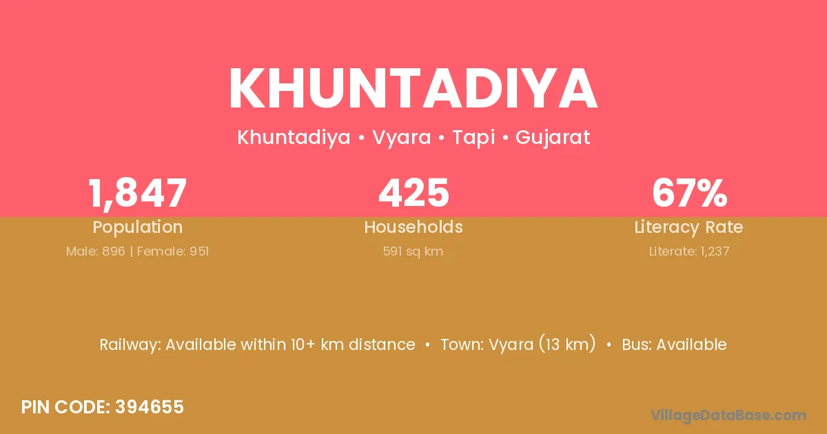 Vyara (13 km) is the nearest town to Khuntadiya village for major economic activities and is located approximately 13 km away.