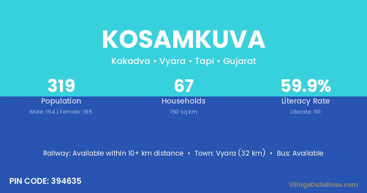 Vyara (32 km) is the nearest town to Kosamkuva village for major economic activities and is located approximately 32 km away.