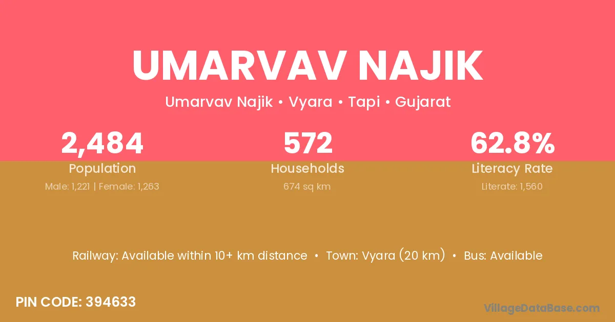 Vyara (20 km) is the nearest town to Umarvav Najik village for major economic activities and is located approximately 20 km away.