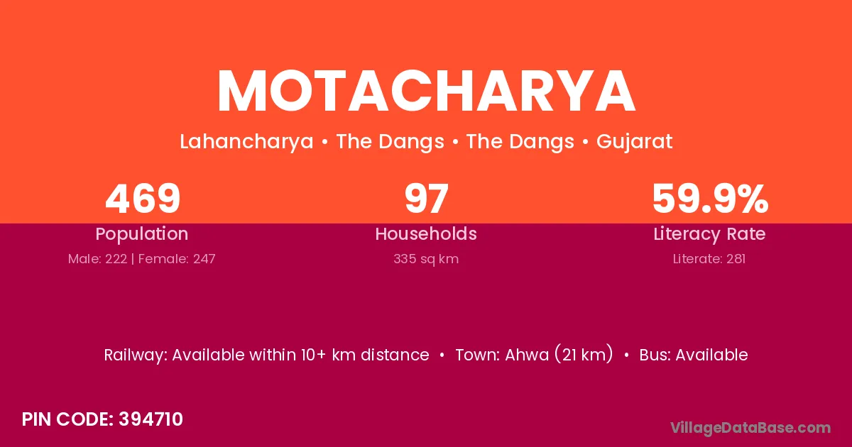 Ahwa (21 km) is the nearest town to Motacharya village for major economic activities and is located approximately 21 km away.
