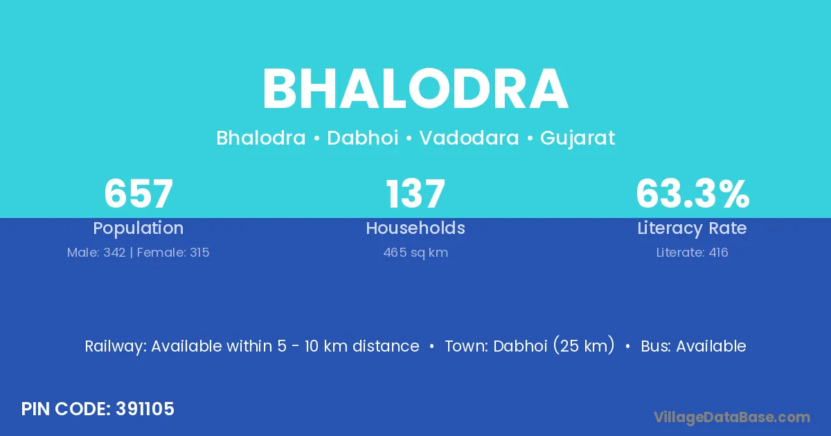 Dabhoi (25 km) is the nearest town to Bhalodra village for major economic activities and is located approximately 25 km away.