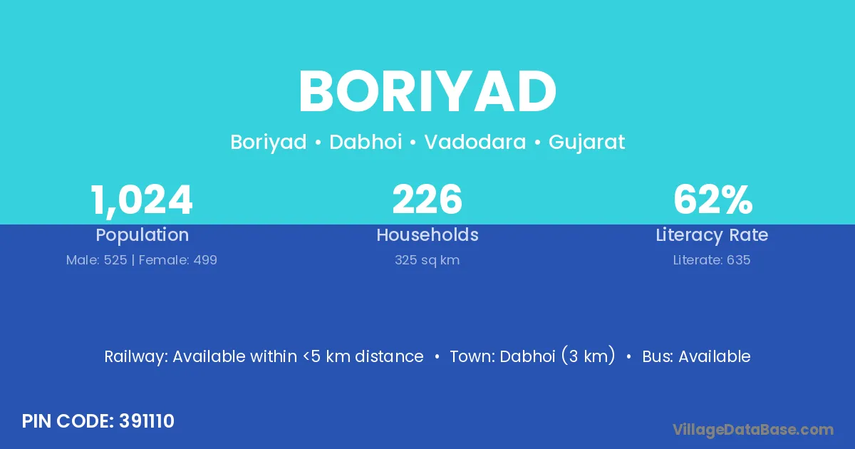 Dabhoi (3 km) is the nearest town to Boriyad village for major economic activities and is located approximately 3 km away.