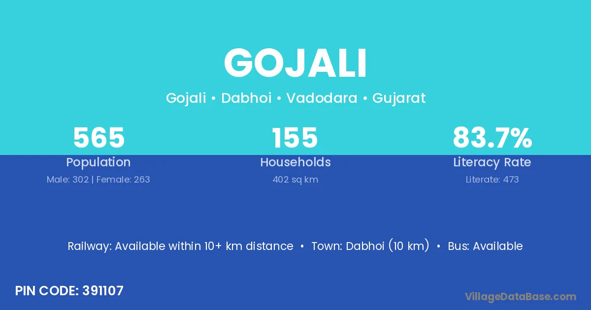 Dabhoi (10 km) is the nearest town to Gojali village for major economic activities and is located approximately 10 km away.