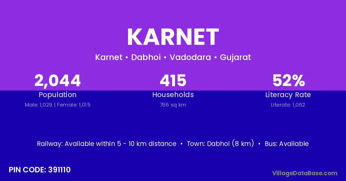 Dabhoi (8 km) is the nearest town to Karnet village for major economic activities and is located approximately 8 km away.