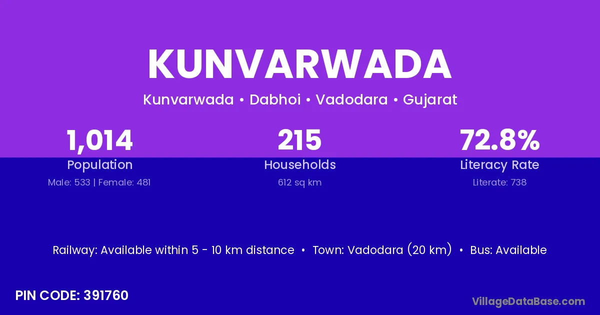 Vadodara (20 km) is the nearest town to Kunvarwada village for major economic activities and is located approximately 20 km away.