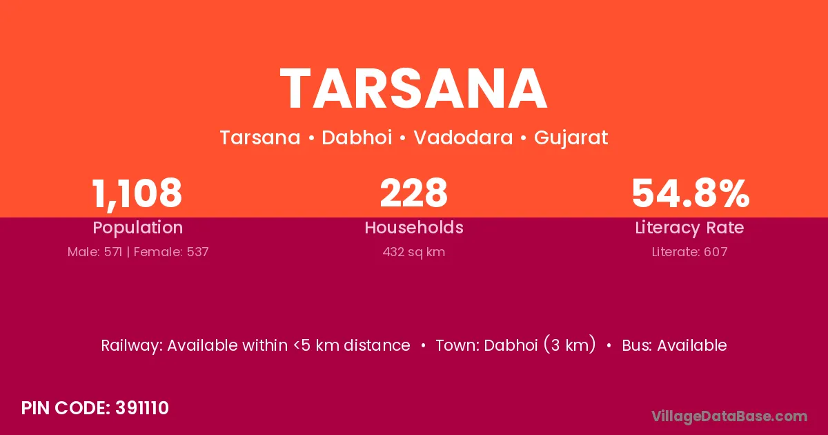 Dabhoi (3 km) is the nearest town to Tarsana village for major economic activities and is located approximately 3 km away.