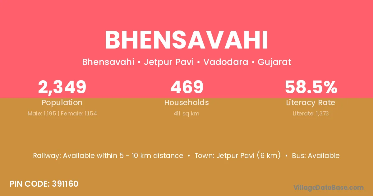 Jetpur Pavi (6 km) is the nearest town to Bhensavahi village for major economic activities and is located approximately 6 km away.