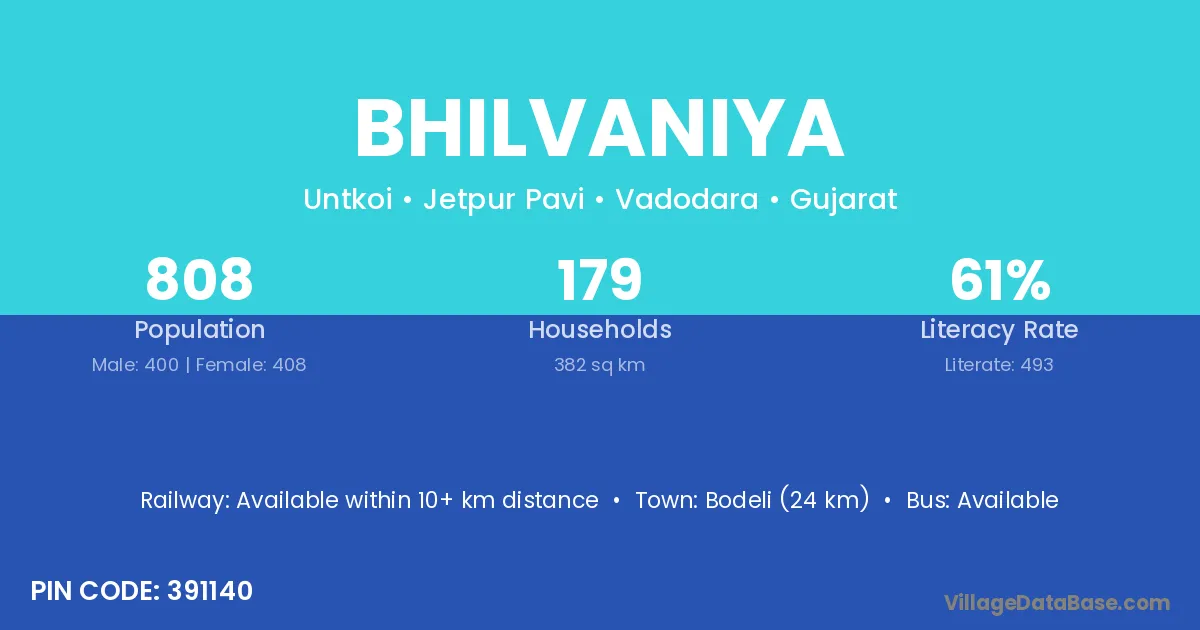 Bodeli (24 km) is the nearest town to Bhilvaniya village for major economic activities and is located approximately 24 km away.