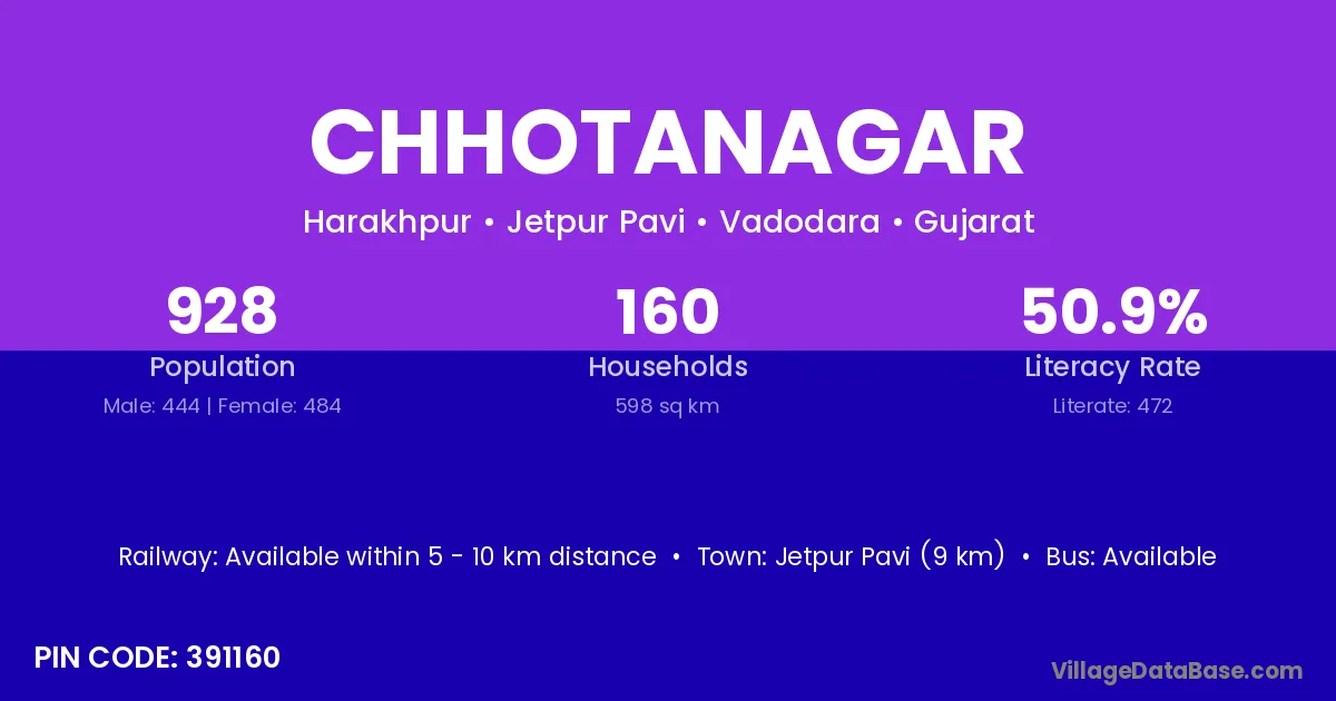 Jetpur Pavi (9 km) is the nearest town to Chhotanagar village for major economic activities and is located approximately 9 km away.