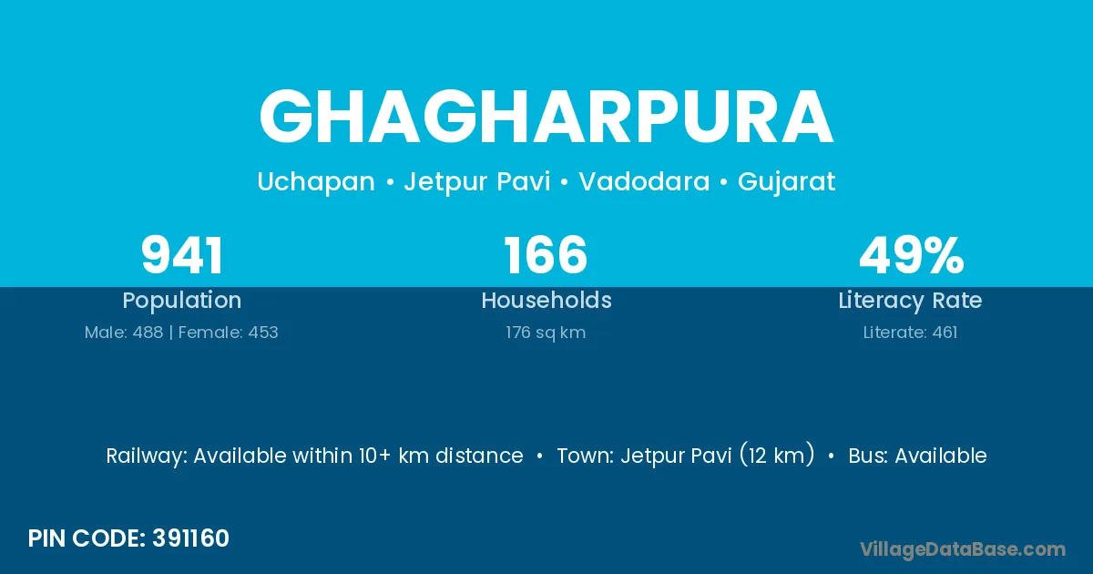 Jetpur Pavi (12 km) is the nearest town to Ghagharpura village for major economic activities and is located approximately 12 km away.