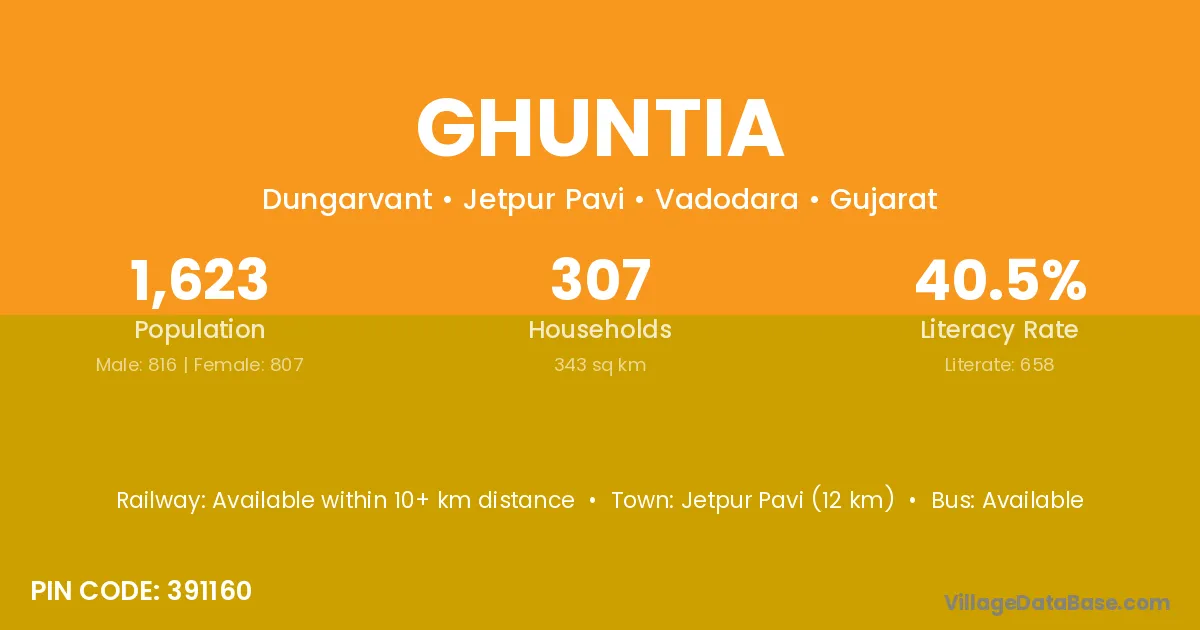 Jetpur Pavi (12 km) is the nearest town to Ghuntia village for major economic activities and is located approximately 12 km away.