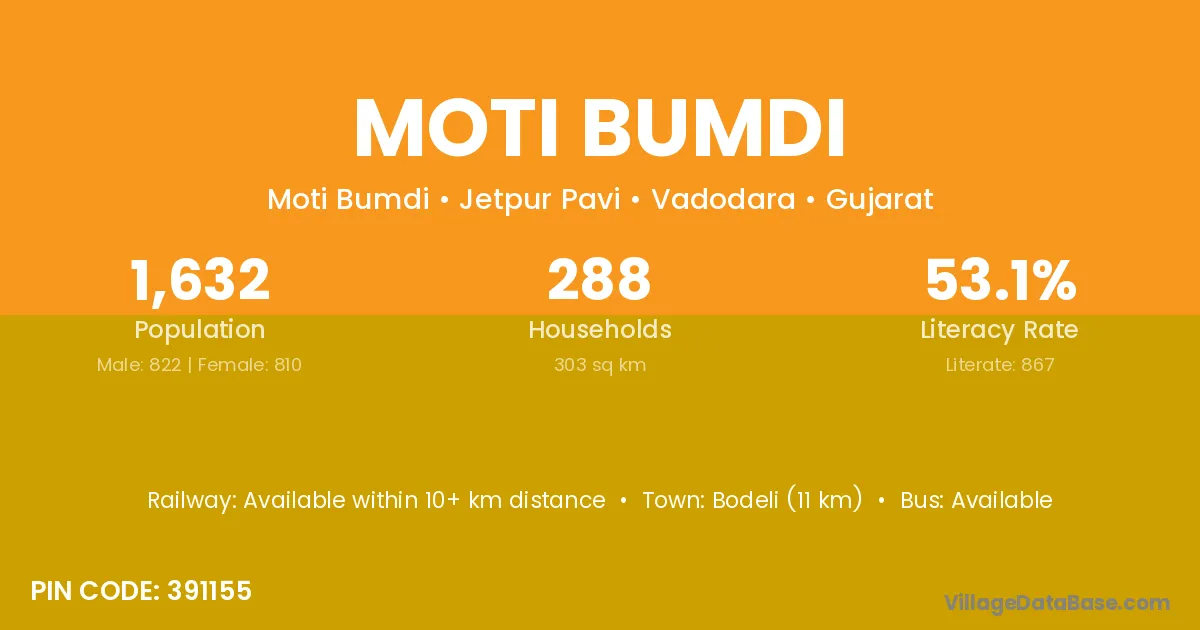 Bodeli (11 km) is the nearest town to Moti Bumdi village for major economic activities and is located approximately 11 km away.