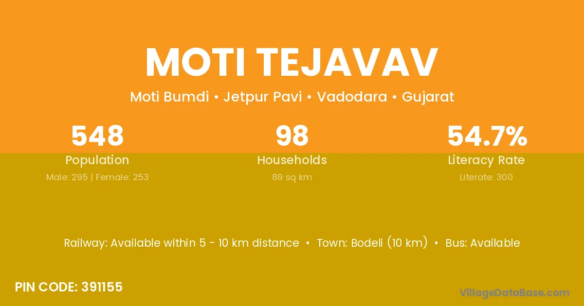 Bodeli (10 km) is the nearest town to Moti Tejavav village for major economic activities and is located approximately 10 km away.