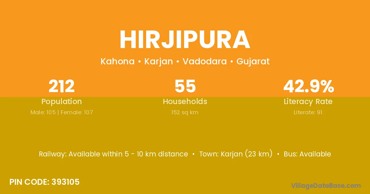 Karjan (23 km) is the nearest town to Hirjipura village for major economic activities and is located approximately 23 km away.