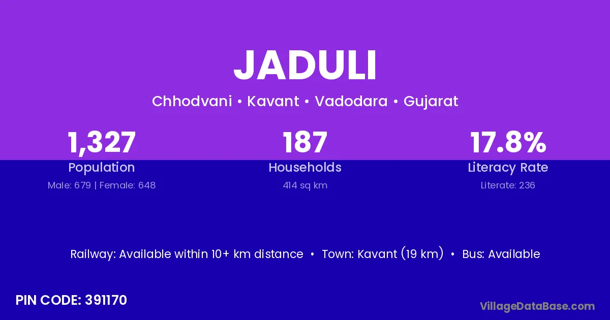 Kavant (19 km) is the nearest town to Jaduli village for major economic activities and is located approximately 19 km away.