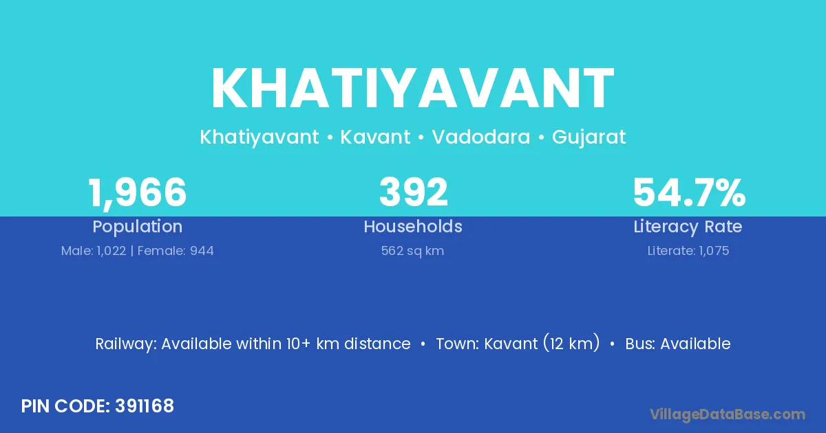 Kavant (12 km) is the nearest town to Khatiyavant village for major economic activities and is located approximately 12 km away.