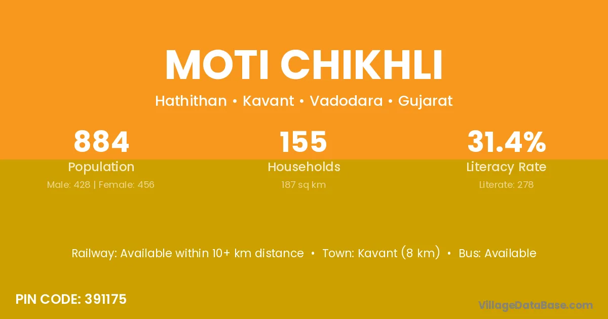 Kavant (8 km) is the nearest town to Moti Chikhli village for major economic activities and is located approximately 8 km away.
