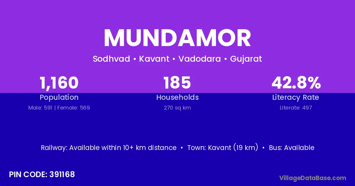 Kavant (19 km) is the nearest town to Mundamor village for major economic activities and is located approximately 19 km away.