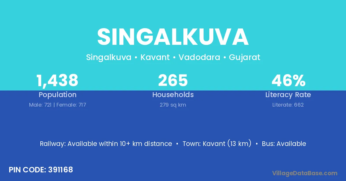 Kavant (13 km) is the nearest town to Singalkuva village for major economic activities and is located approximately 13 km away.