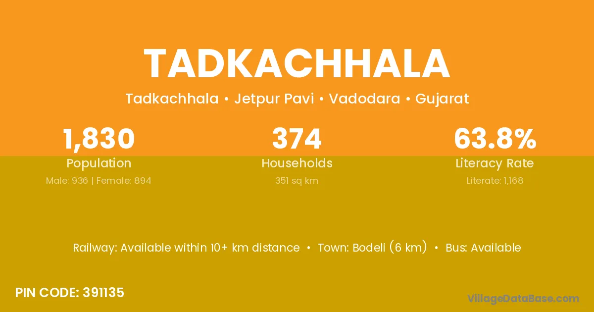 Kavant (15 km) is the nearest town to Tadkachhala village for major economic activities and is located approximately 15 km away.