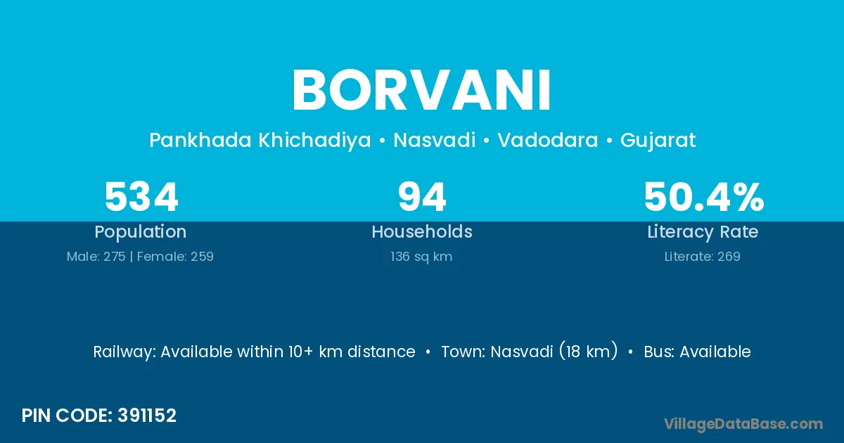 Nasvadi (18 km) is the nearest town to Borvani village for major economic activities and is located approximately 18 km away.
