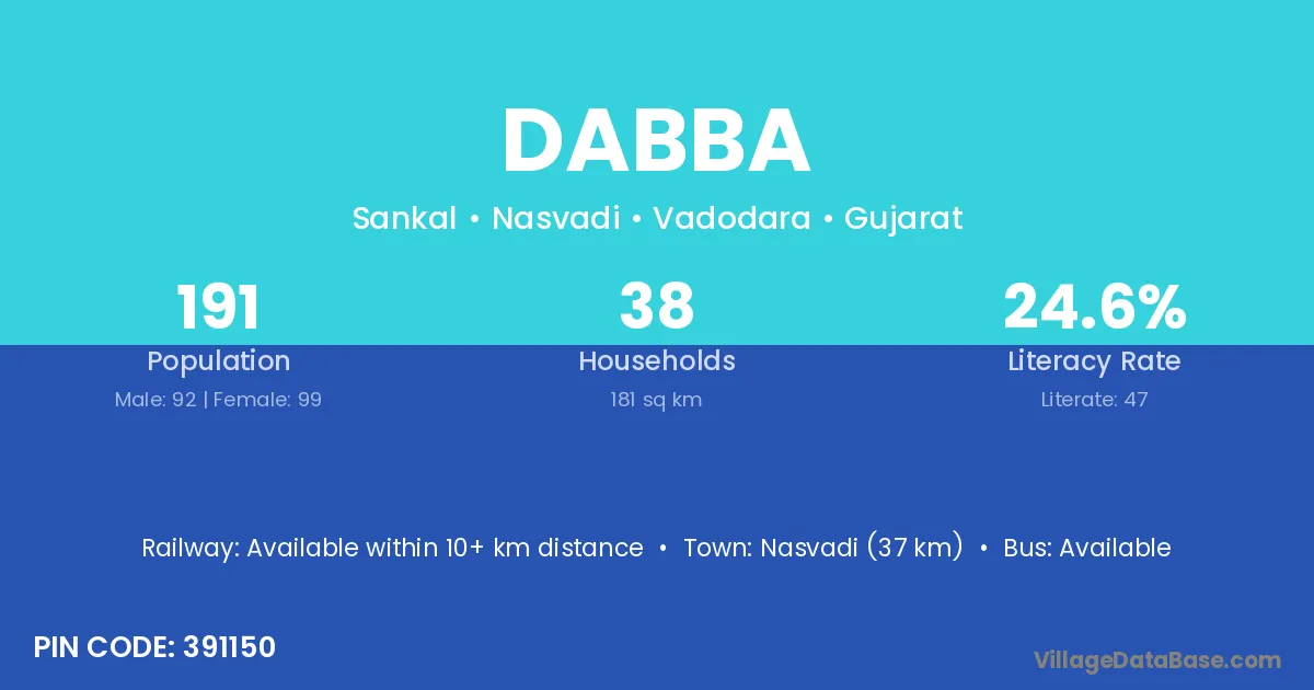 Nasvadi (37 km) is the nearest town to Dabba village for major economic activities and is located approximately 37 km away.