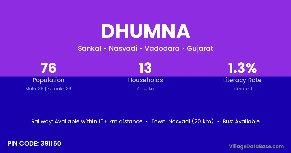 Nasvadi (20 km) is the nearest town to Dhumna village for major economic activities and is located approximately 20 km away.