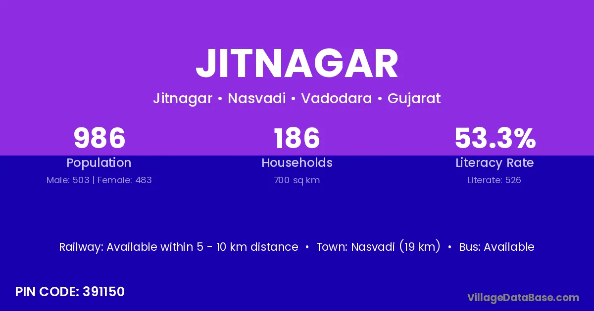 Nasvadi (19 km) is the nearest town to Jitnagar village for major economic activities and is located approximately 19 km away.