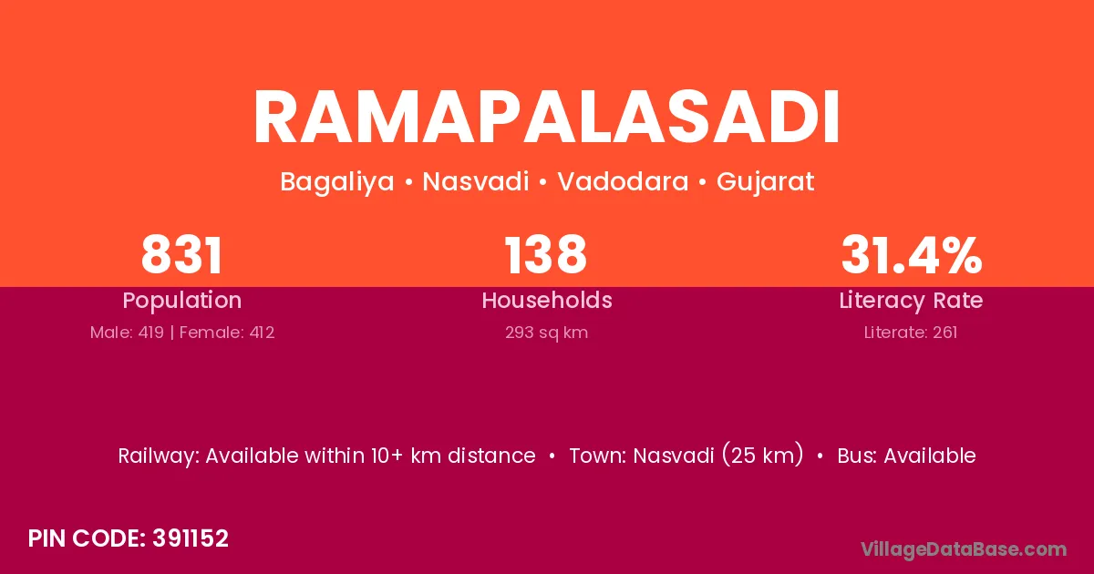 Ramapalasadi village has a total population of 831 people, of which 419 are males and 412 are females.