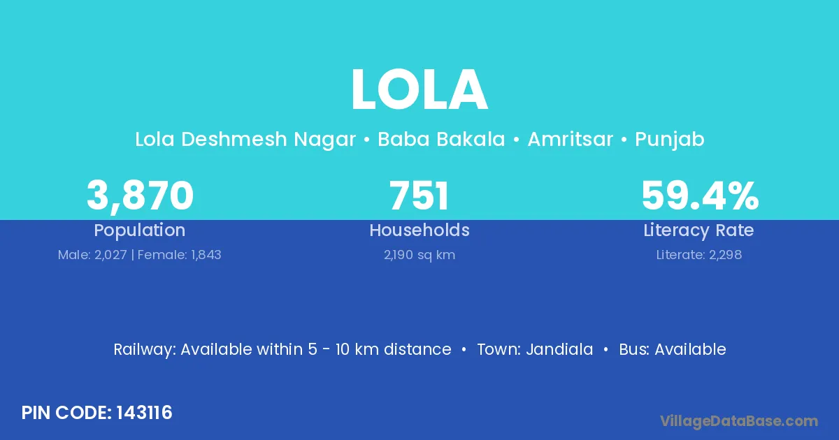 The literacy rate of Lola village is 72.18%. Male literacy stands at 79.13% and female literacy at 64.52%.