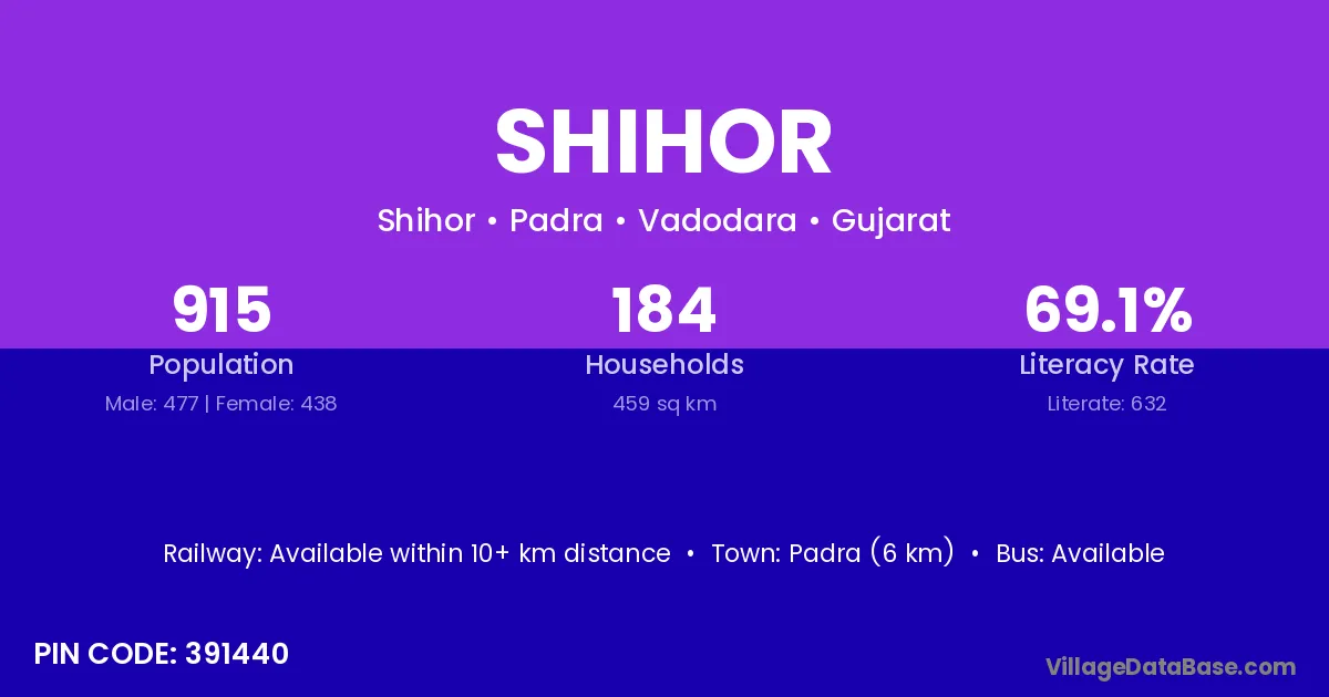 Padra (6 km) is the nearest town to Shihor village for major economic activities and is located approximately 6 km away.
