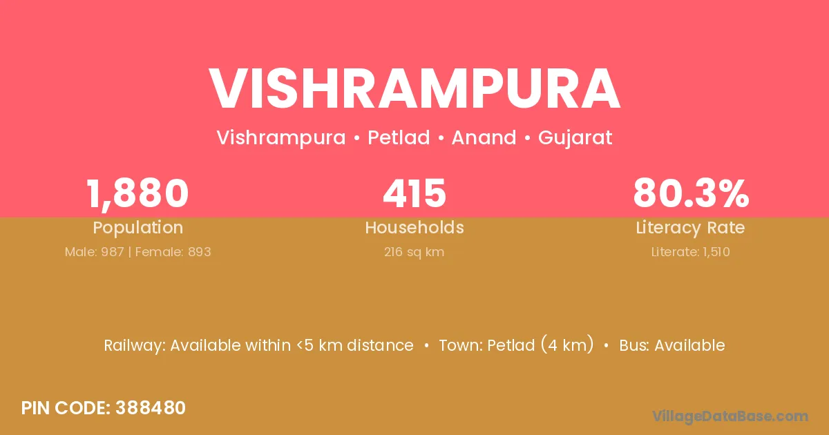 Padra (15 km) is the nearest town to Vishrampura village for major economic activities and is located approximately 15 km away.