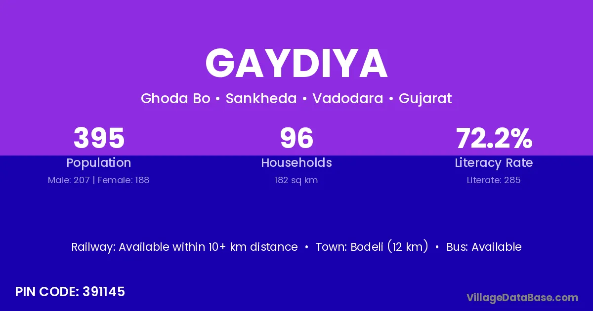 Bodeli (12 km) is the nearest town to Gaydiya village for major economic activities and is located approximately 12 km away.