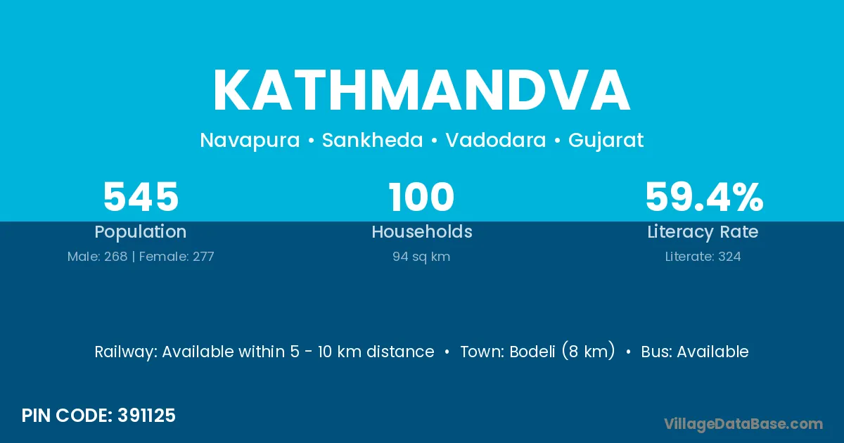 Bodeli (8 km) is the nearest town to Kathmandva village for major economic activities and is located approximately 8 km away.